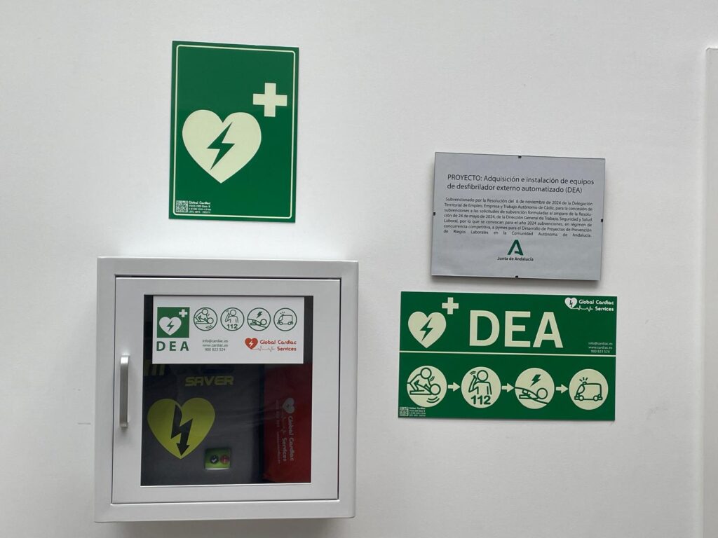 This new project has been carried out with the support of the Junta de Andalucía thanks to the project ‘Acquisition and installation of Automated External Defibrillator (AED) equipment’, a project subsidised by the Resolution of 6 November 2024 of the Territorial Delegation of Employment, Enterprise and Self-Employment of Cadiz, for the granting of subsidies to applications for subsidies made under the Resolution of 24 May 2024, of the Directorate General for Labour, Occupational Safety and Health, which calls for subsidies for 2024, on a competitive basis, to SMEs for the Development of Occupational Risk Prevention Projects in the Autonomous Community of Andalusia.